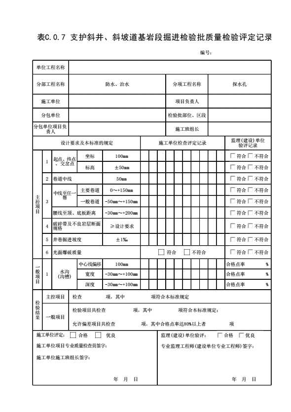 表格名称:表C.0.7 支护斜井、斜坡道基岩段掘进检验批质量检验评定记录