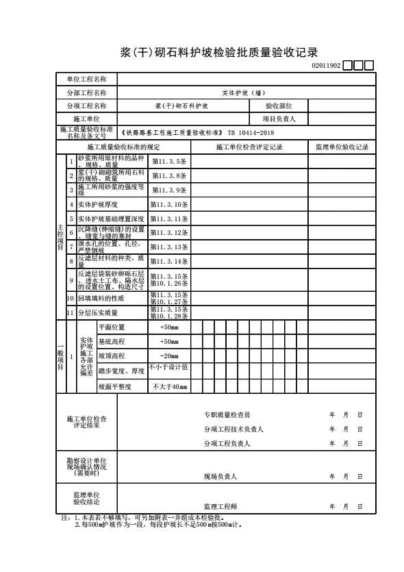 表格名称:02011902 浆(干)砌石料护坡检验批质量验收记录