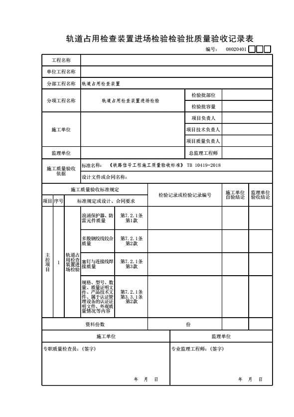 表格名称:08020401 轨道占用检查装置进场检验检验批质量验收记录表