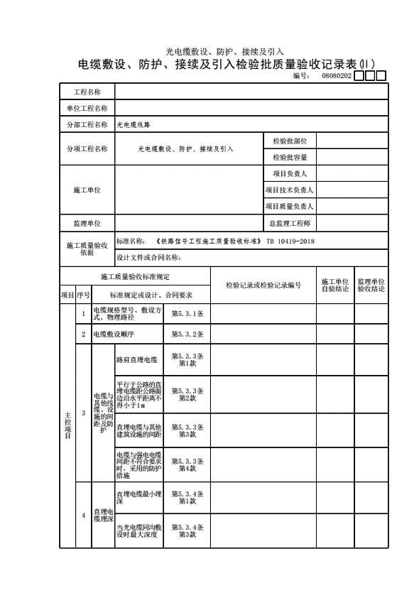 表格名称:08080202 【光电缆敷设、防护、接续及引入】电缆敷设、防护、接续及引入检验批质量验收记录表(Ⅱ)