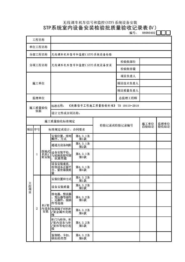 表格名称:08080402 【无线调车机车信号和监控(STP)系统设备安装】STP系统室内设备安装检验批质量验收记录表(Ⅳ)