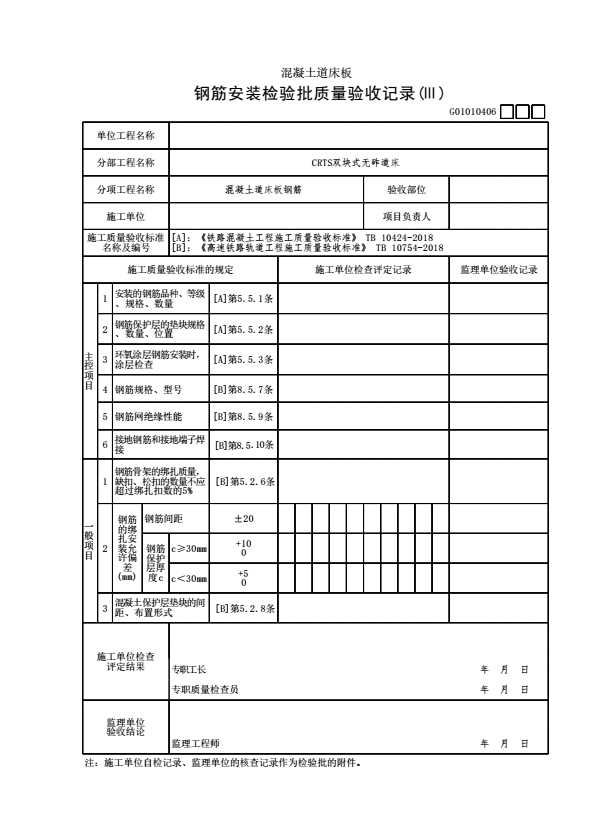 表格名称:G01010406 【混凝土道床板】钢筋安装检验批质量验收记录(Ⅲ)