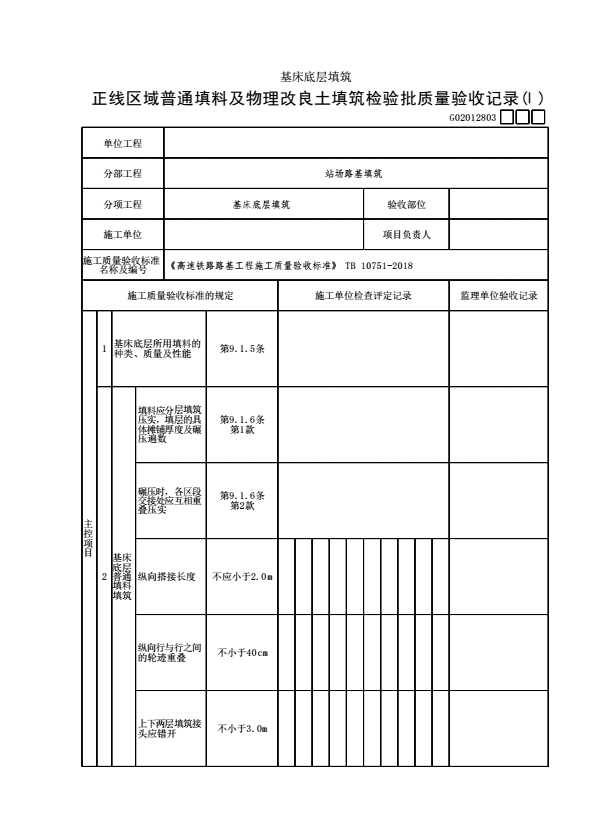 表格名称:G02012803 【基床底层填筑】正线区域普通填料及物理改良土填筑检验批质量验收记录(Ⅰ)