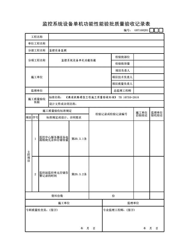 表格名称:G07160201 监控系统设备单机功能性能检验批质量验收记录表