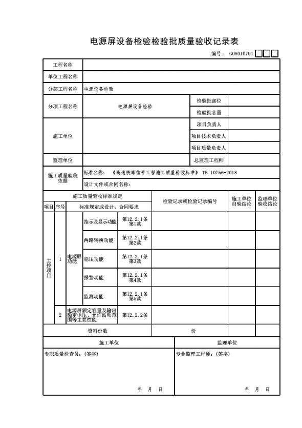表格名称:G08010701 电源屏设备检验检验批质量验收记录表