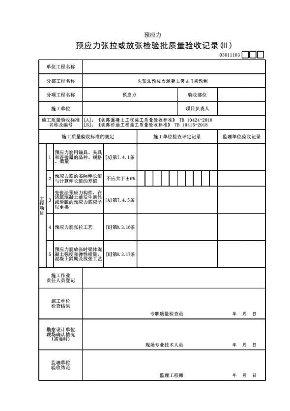 表格名称:03011103 预应力张拉或放张检验批质量验收记录(Ⅲ)