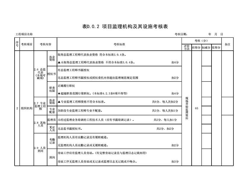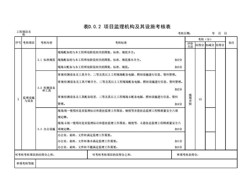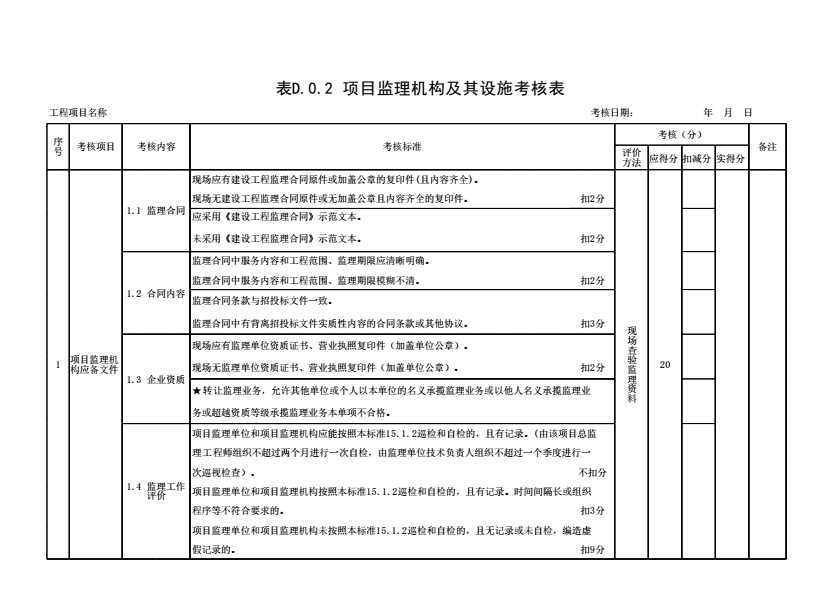 表格名称:表D.0.2 项目监理机构及其设施考核表
