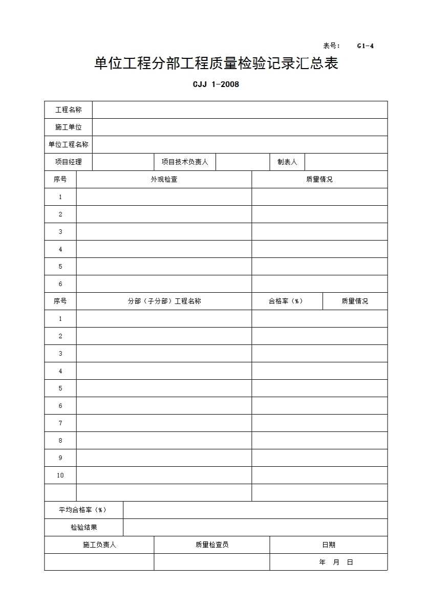表格名称:G1-4 单位工程分部工程质量检验记录汇总表