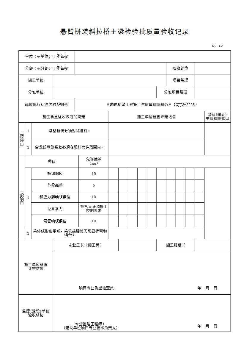 表格名称:悬臂拼装斜拉桥主梁检验批质量验收记录