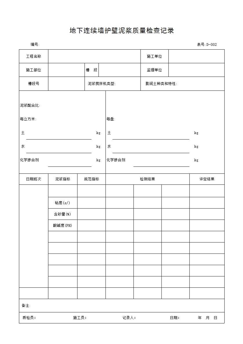 表格名称:D-002 地下连续墙护壁泥浆质量检查记录