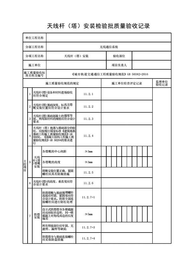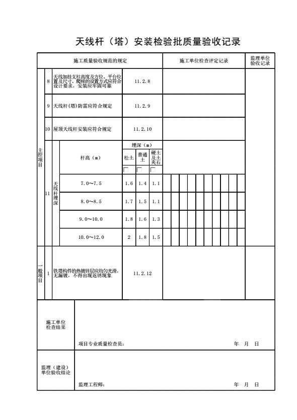 表格名称:天线杆(塔)安装检验批质量验收记录