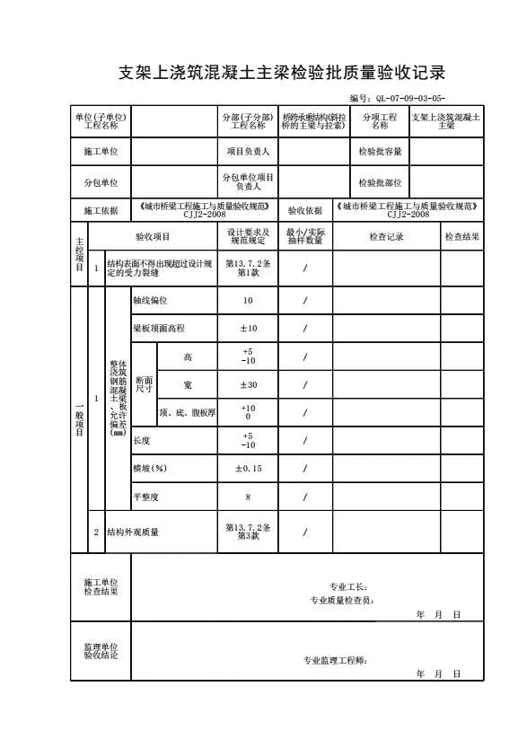 表格名称:支架上浇筑混凝土主梁检验批质量验收记录
