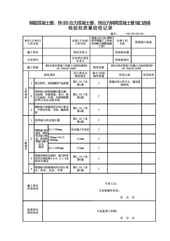 表格名称:钢筋混凝土管、预(自)应力混凝土管、预应力钢筒混凝土管接口连接检验批质量验收记录