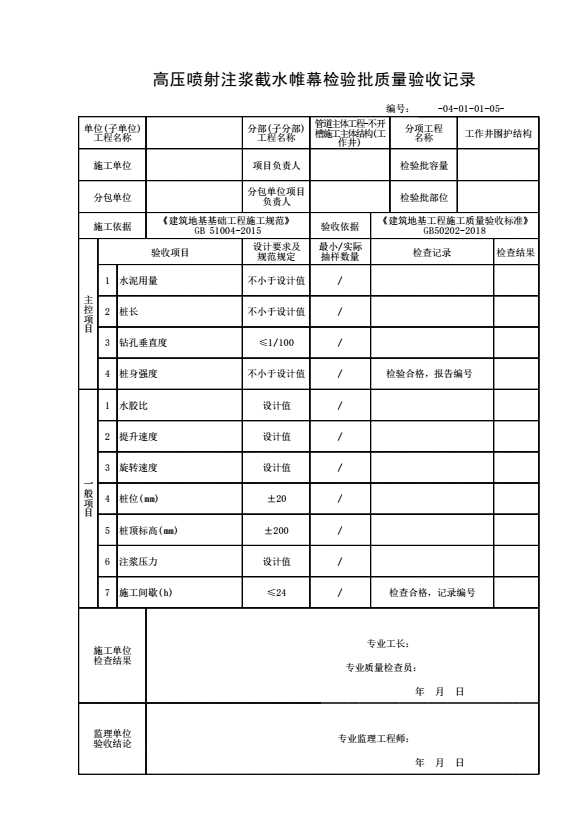 表格名称:高压喷射注浆截水帷幕检验批质量验收记录