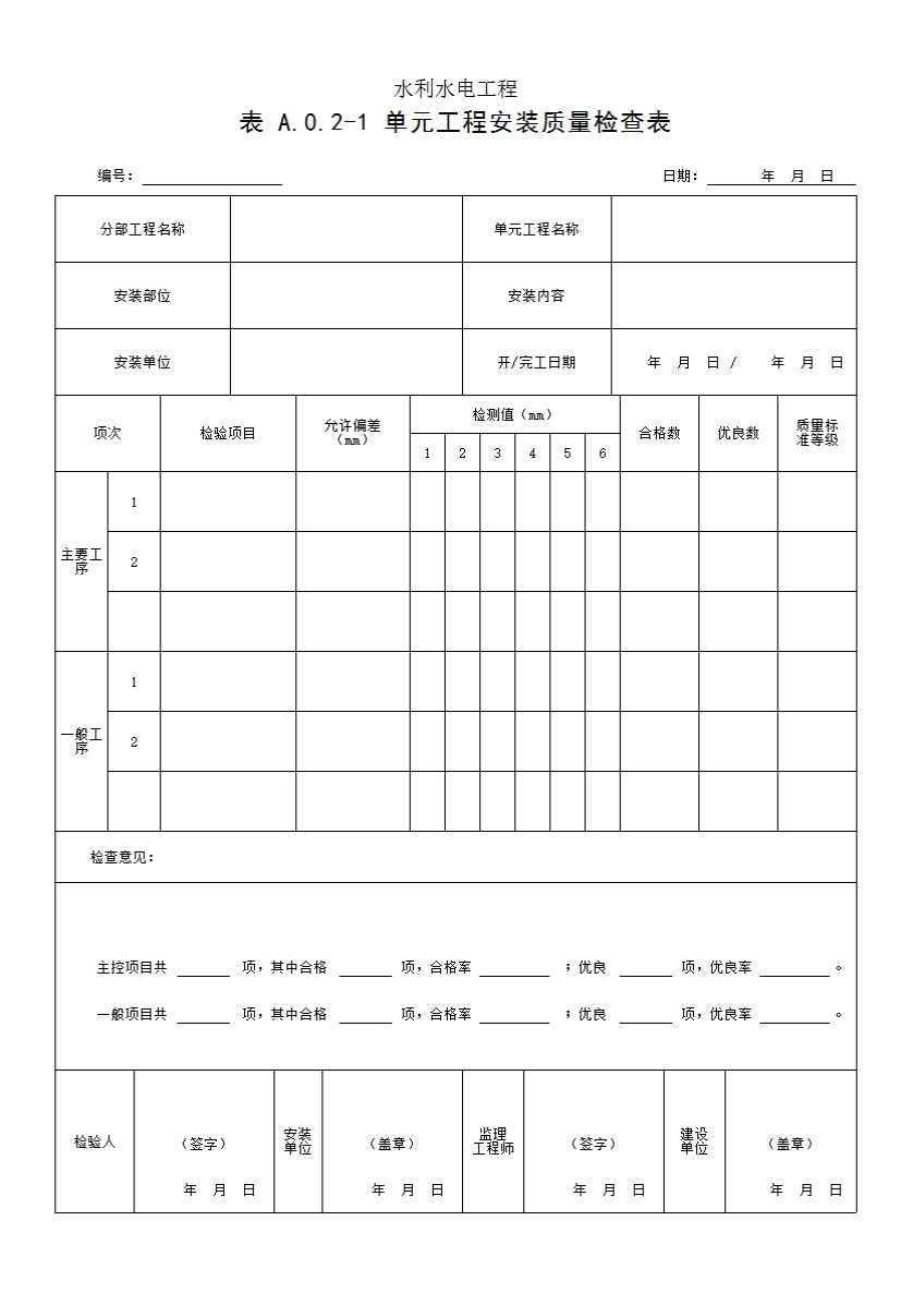 表格名称:表 A.0.2-1 单元工程安装质量检查表