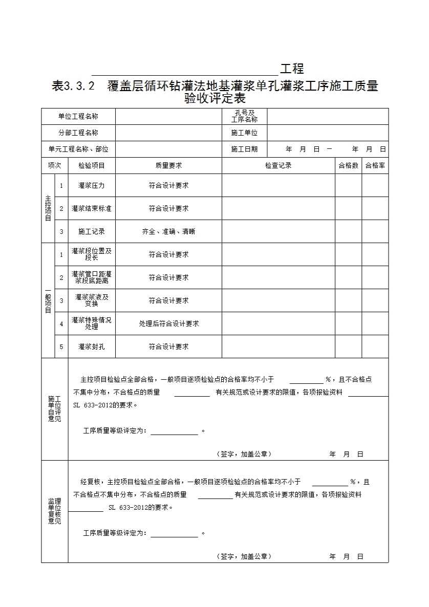 表3.3.2  覆盖层循环钻灌法地基灌浆单孔灌浆工序施工质量验收评定表填表要求