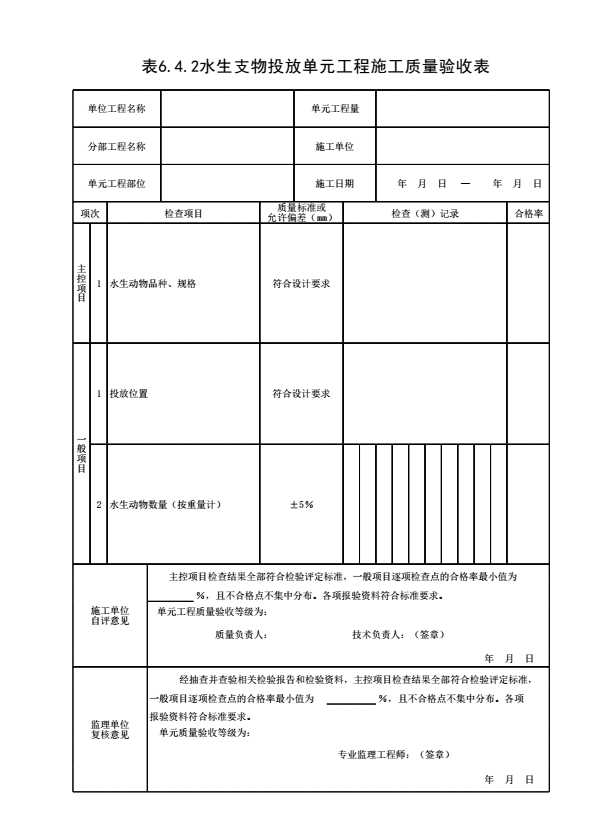 表6.4.2 水生支物投放单元工程施工质量验收表