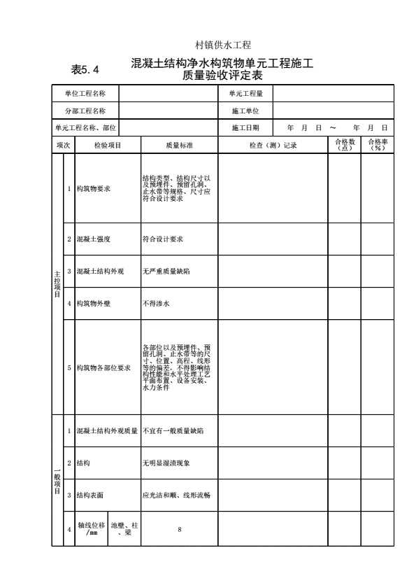 表格名称:表5.4 混凝土结构净水构筑物单元工程施工质量验收评定表