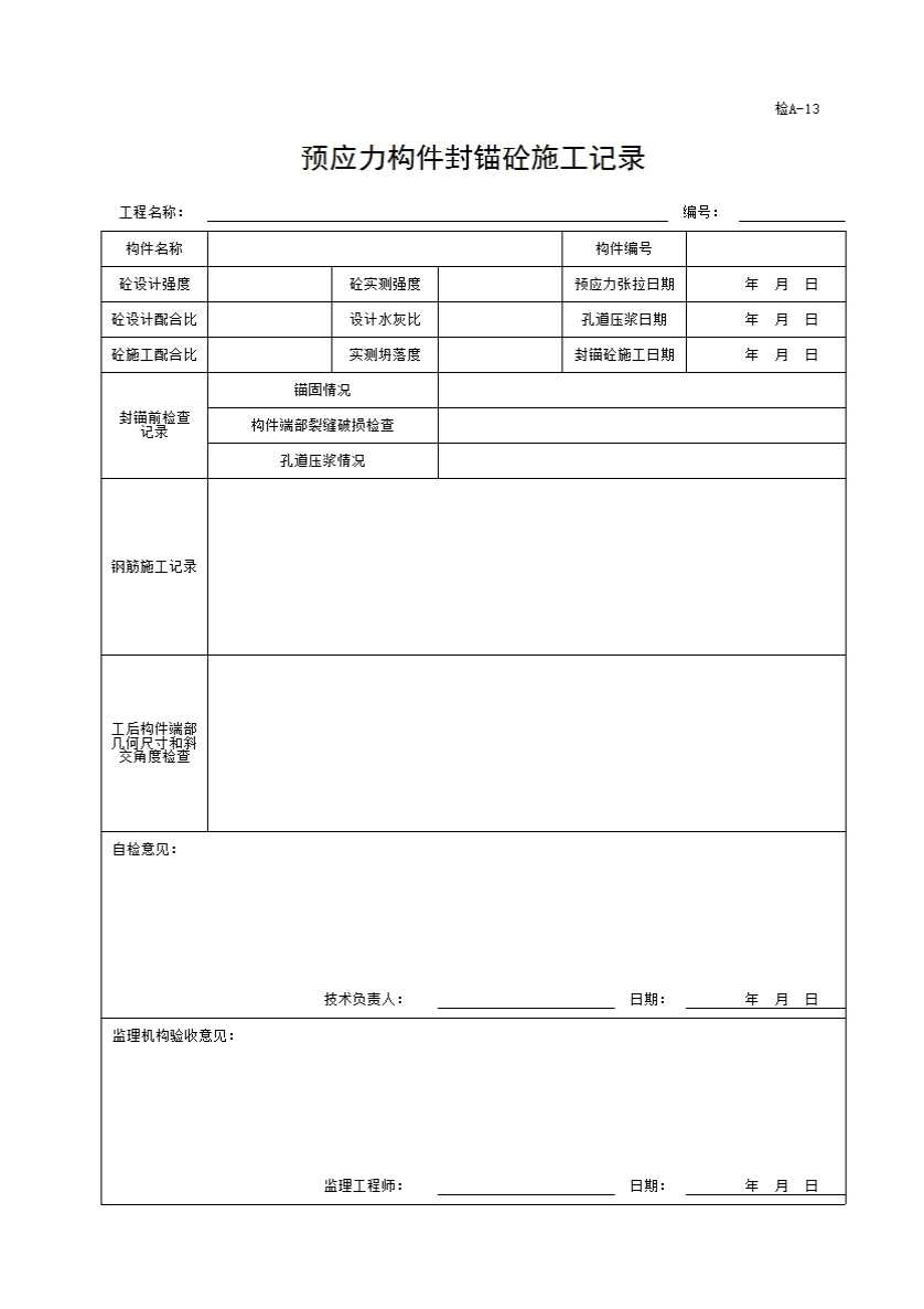 表格名称:13、(评A-13)预应力构件封锚砼施工记录
