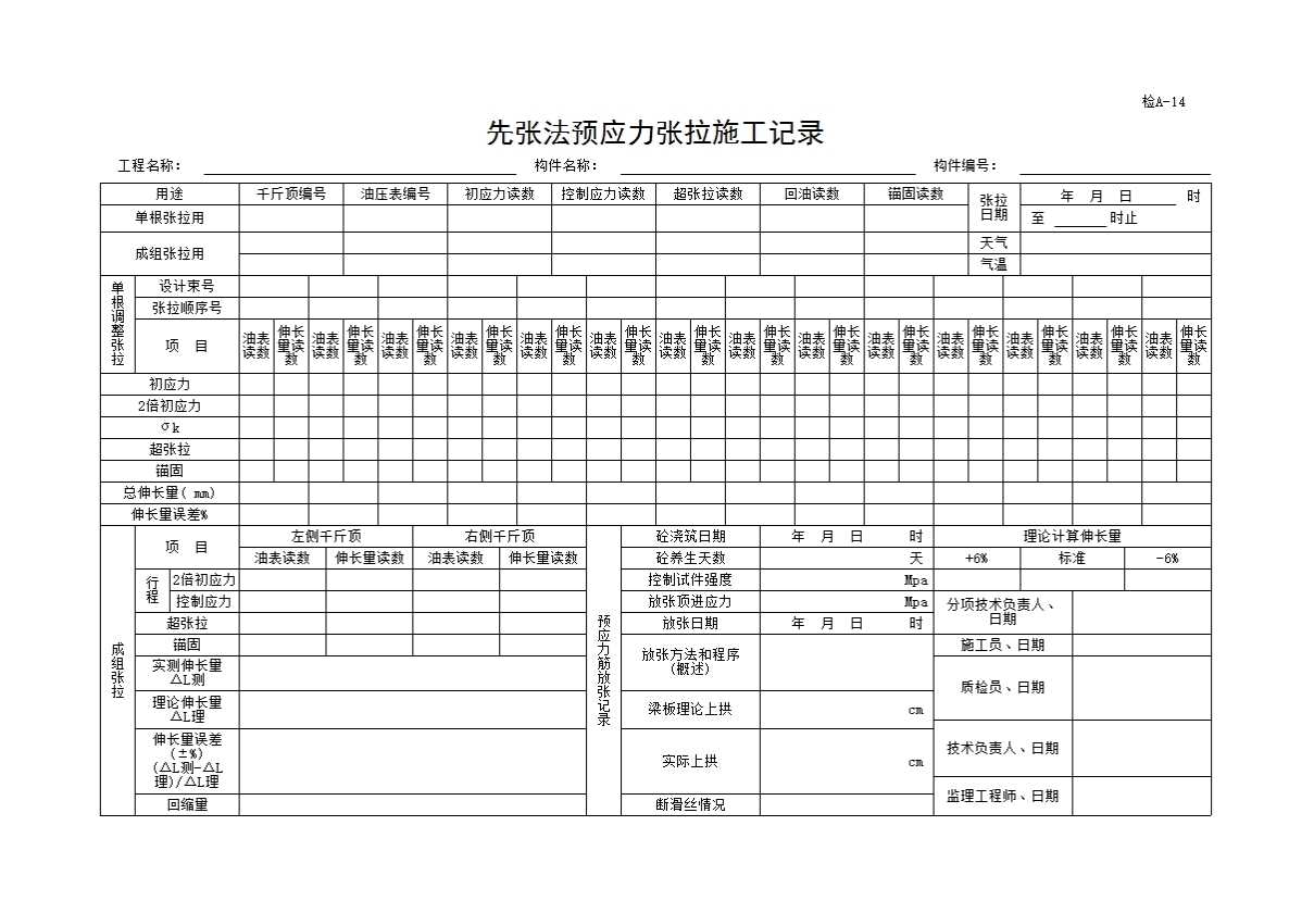 表格名称:14、(评A-14)先张法预应力张拉施工记录