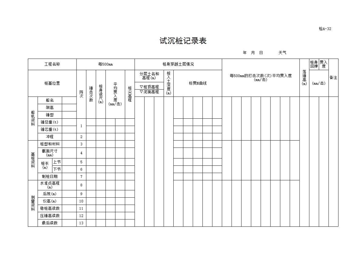 表格名称:32、(评A-32)试沉桩记录表