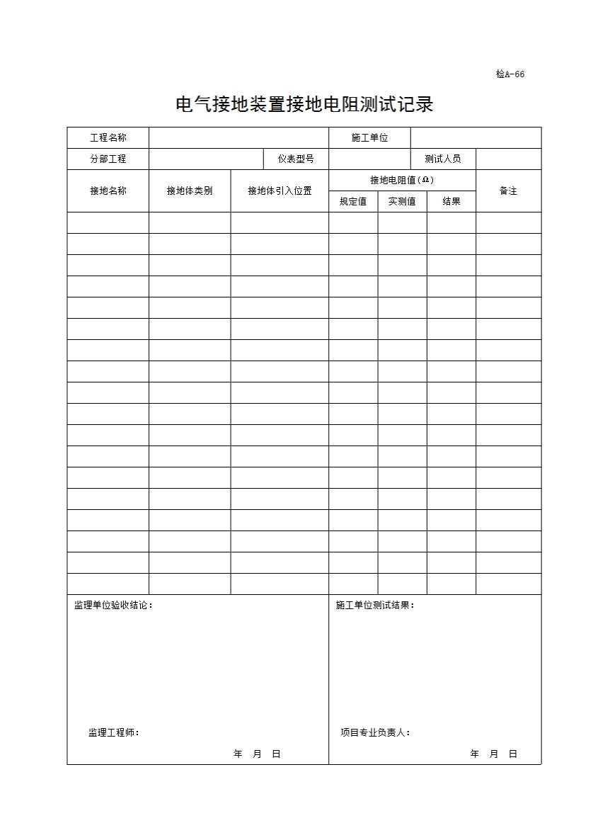 表格名称:66、(评A-66)电气接地装置接地电阻测试记录