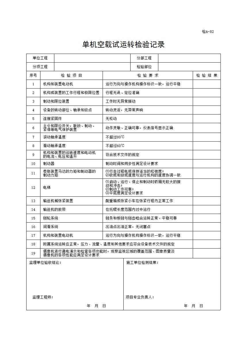 表格名称:82、(评A-82)单机空载试运转检验记录