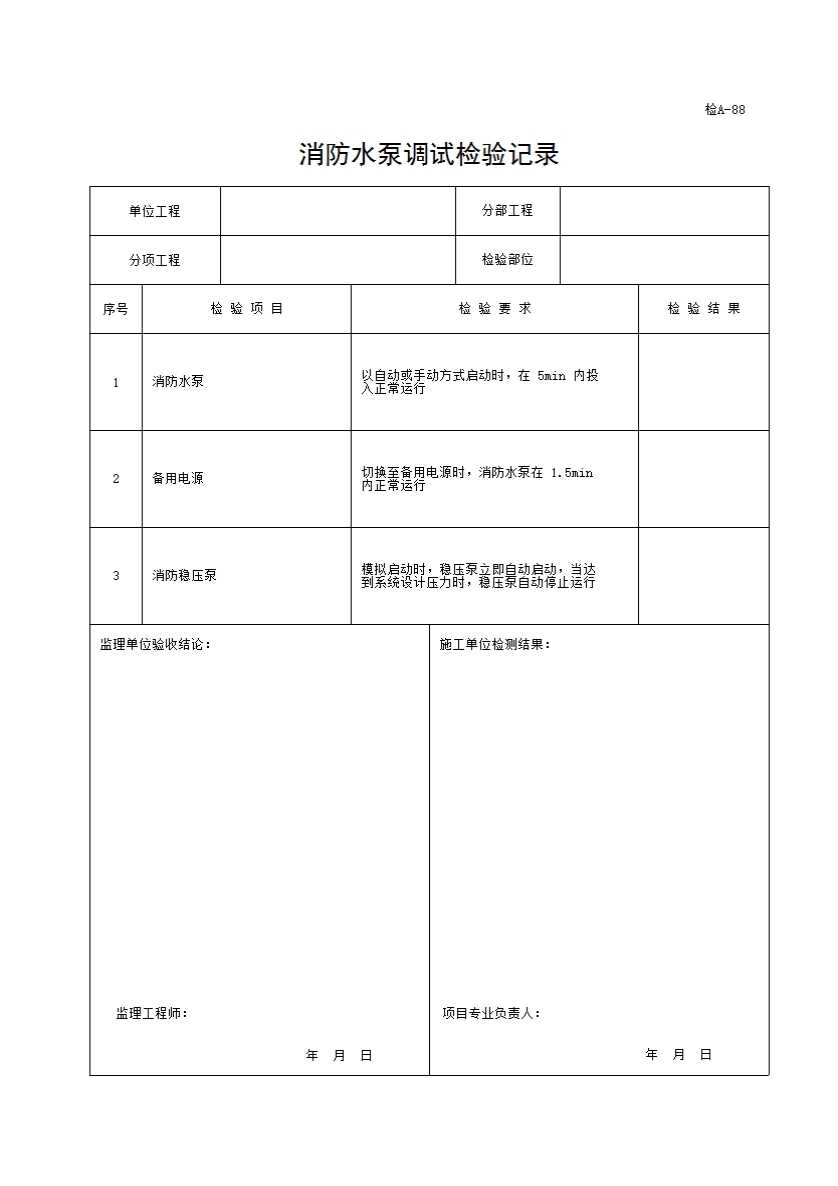 表格名称:88、(评A-88)消防水泵调试检验记录