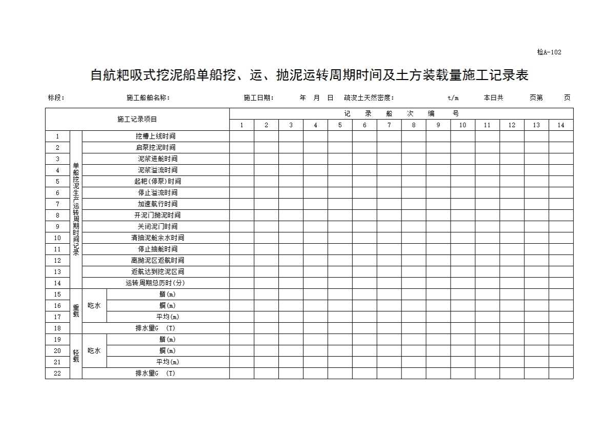 表格名称:102、(评A-102)自航耙吸式挖泥船单船挖、运、抛泥运转周期时间及土方装载量施工记录表