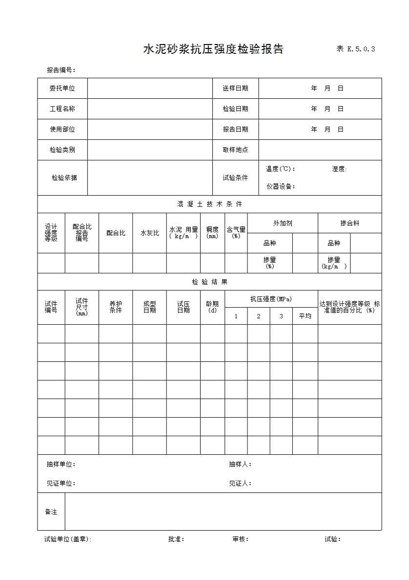 表格名称:表K.5.0.3 水泥砂浆抗压强度检验报告