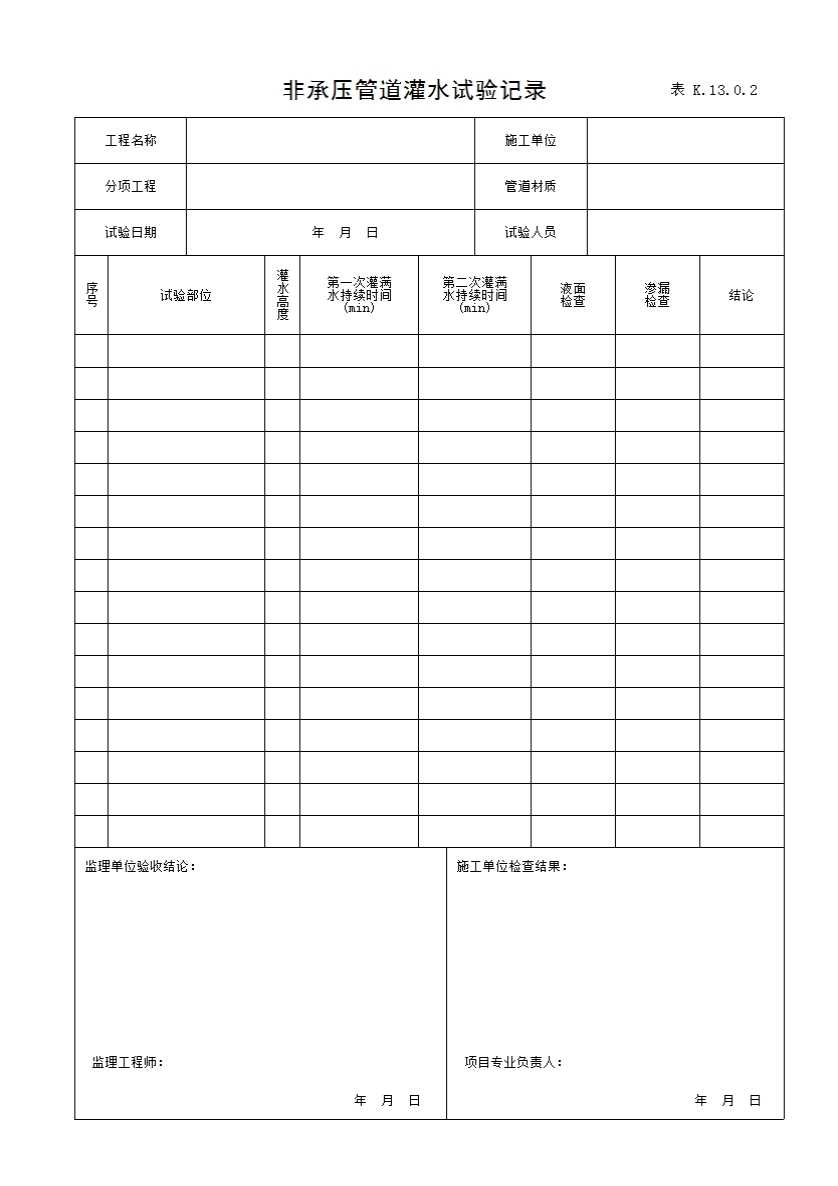 表格名称:表K.13.0.2 非承压管道灌水试验记录