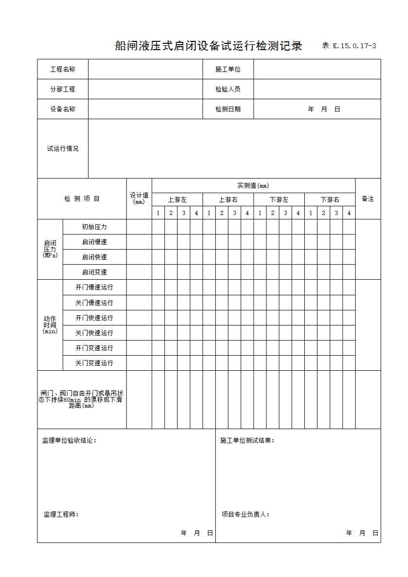 表格名称:表K.15.0.17-3 船闸液压式启闭设备试运行检测记录