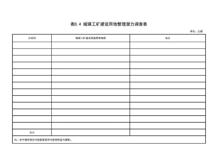 表格名称:表D.4 城镇工矿建设用地整理潜力调查表