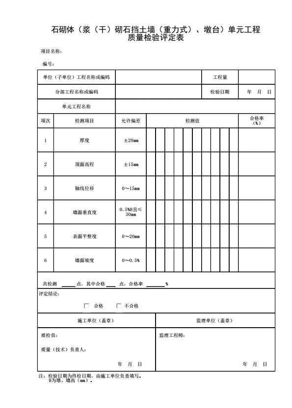 表格名称:石砌体(浆(干)砌石挡土墙(重力式)、墩台)单元工程质量检验评定表