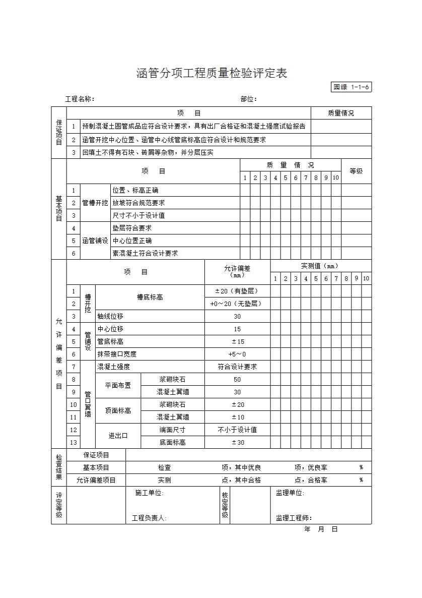 表格名称:涵管分项工程质量检验评定表