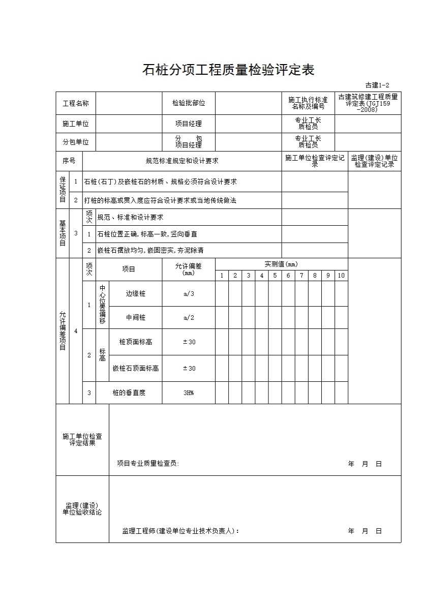 表格名称:古建1-2 石桩分项工程质量检验评定表