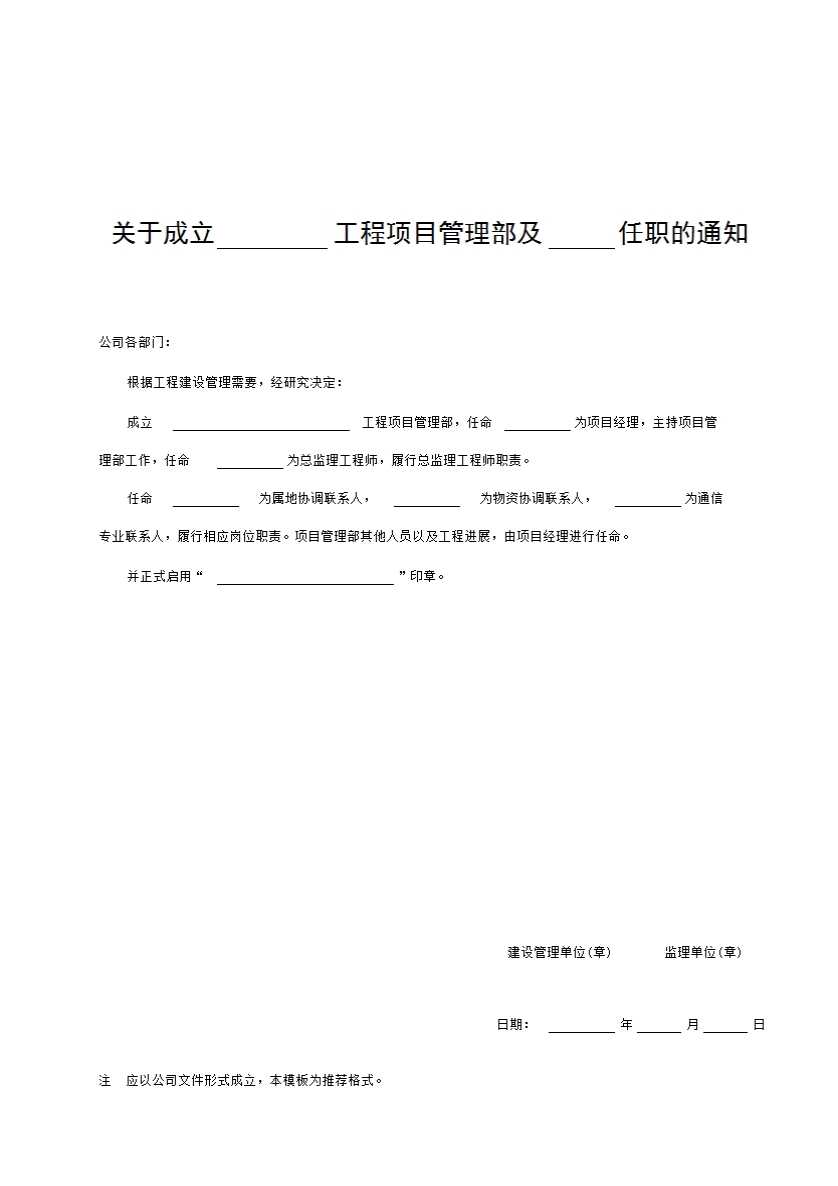 表格名称:XSZ1 关于成立____工程项目管理部及____任职的通知