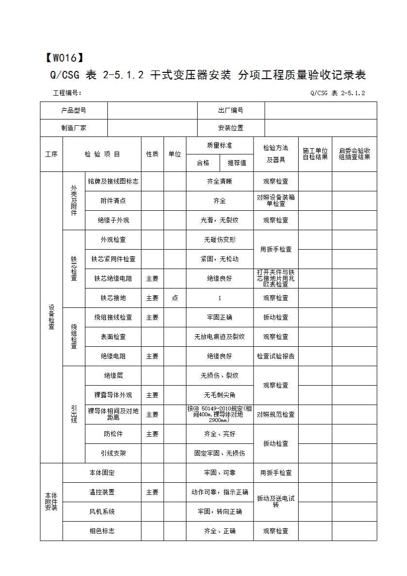 QCSG 表 2-5.1.2 干式变压器安装 分项工程质量验收记录表