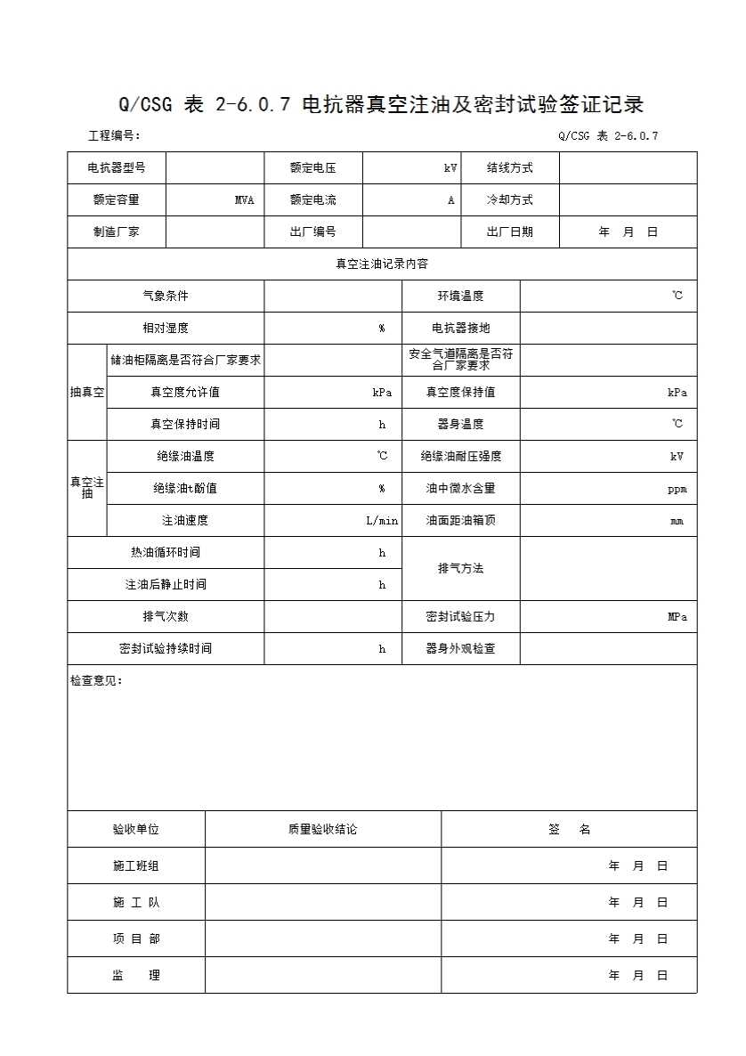 表格名称:QCSG 表 2-6.0.7 电抗器真空注油及密封试验签证记录