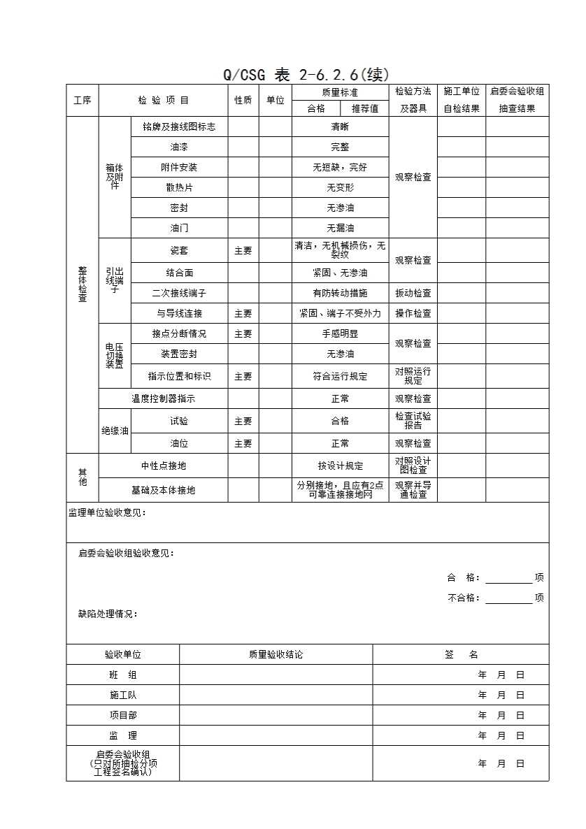QCSG 表 2-6.2.6 中性点电抗器安装 分项工程质量验收记录表