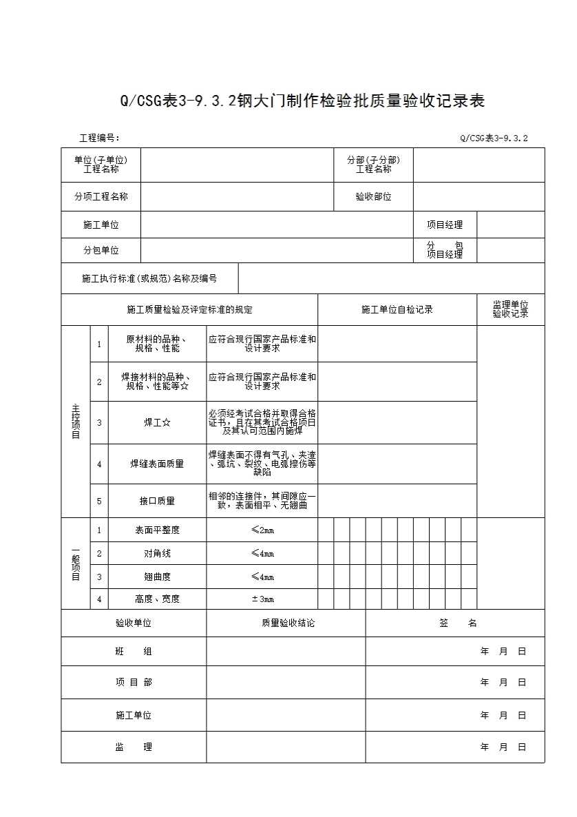 QCSG 表 3-9.3.2 钢大门制作检验批质量验收记录表