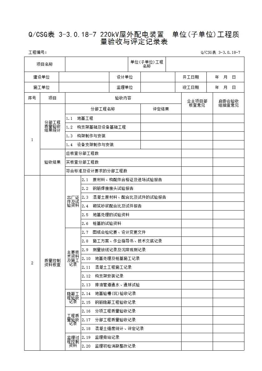 QCSG 表 3-3.0.18-7 220kV屋外配电装置 单位(子单位)工程质量验收与评定记录表