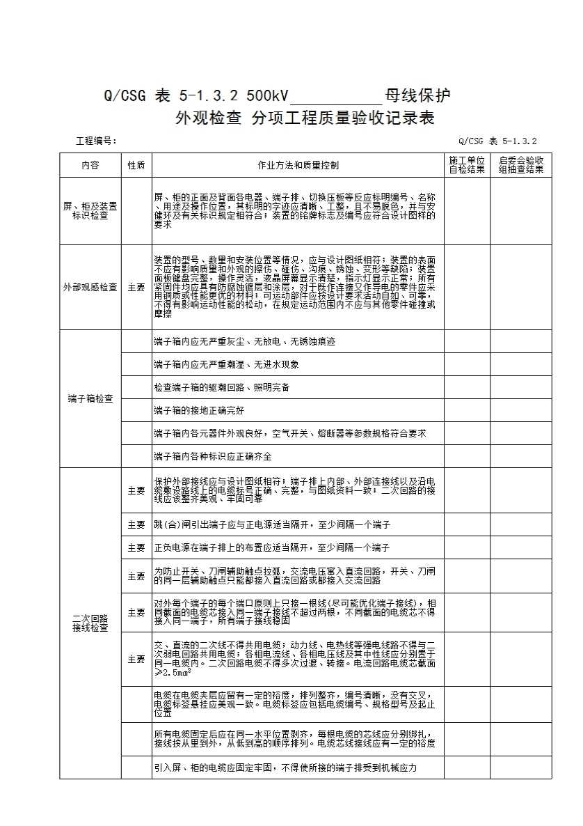 QCSG 表 5-1.3.2 500kV_____母线保护 外观检查 分项工程质量验收记录表