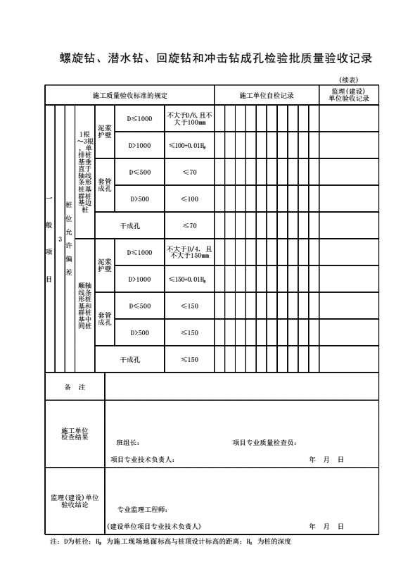 表格名称:螺旋钻、潜水钻、回旋钻和冲击钻成孔检验批质量验收记录