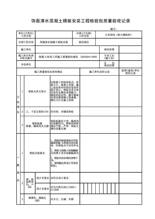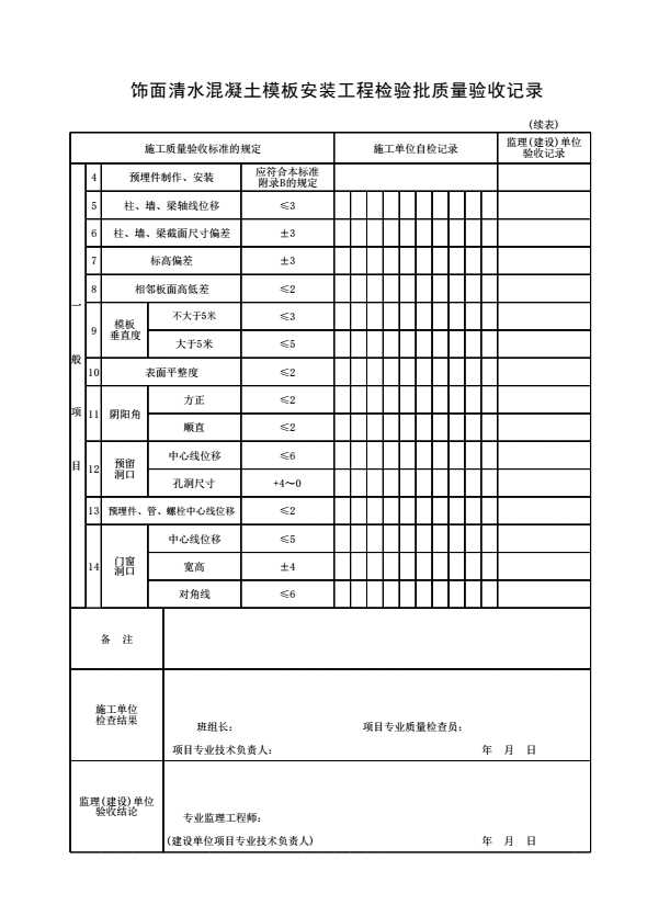表格名称:饰面清水混凝土模板安装工程检验批质量验收记录