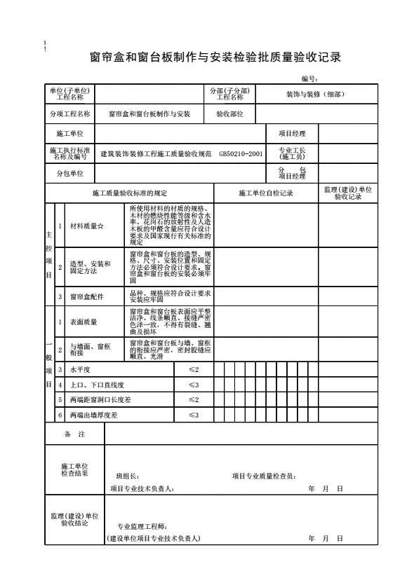 窗帘盒和窗台板制作与安装检验批质量验收记录