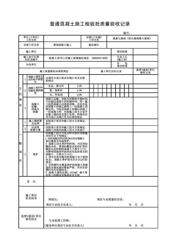 表格名称:普通混凝土施工检验批质量验收记录