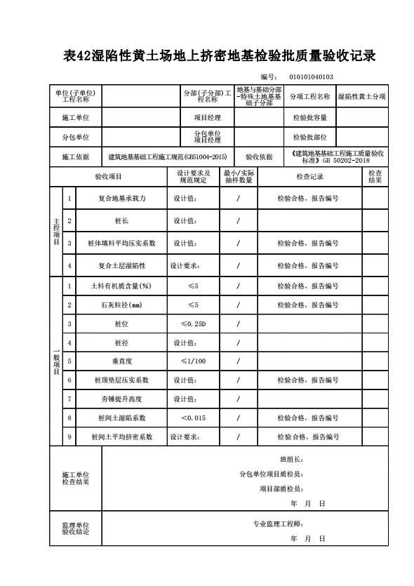 表格名称:010101040103 湿陷性黄土场地上挤密地基检验批质量验收记录