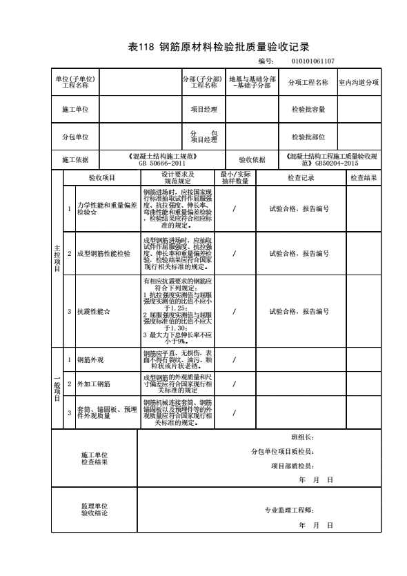 表格名称:010101061107 钢筋原材料检验批质量验收记录