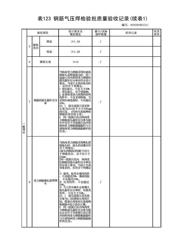 表格名称:010101061311 钢筋气压焊检验批质量验收记录